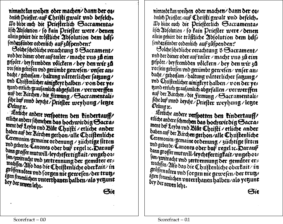 The result on the left is for standard (tiled) Otsu, with scorefract = 0.0, and on the right is modified (tiled) Otsu with scorefract 0.1. For both, most of the background is now properly assigned. On the left the text is a bit heavier throughout, and there is a small amount of noise in the background, but with modified Otsu the text is lighter and generally more evenly weighted.